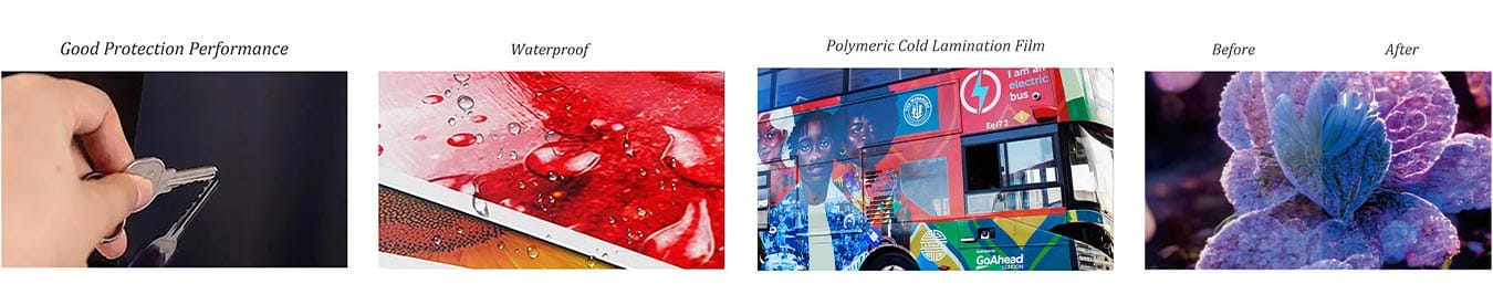 | Polymeric Cold Lamination Film-3001CLM | 70micron | Clear Pemanent | Anti-UV Polymeric | 120gsm | Suitable for various indoor and outdoor advertising signs, posters, exhibition boards, dispiay racks, etc. | 1.07/1.27/1.37/1.52 |